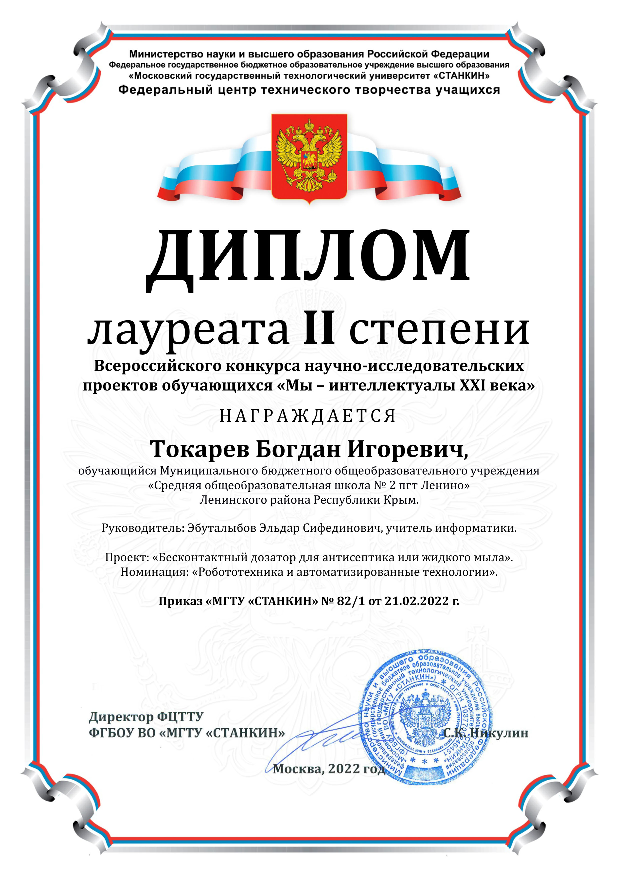 Поздравляем ученика 7А класса Токарева Богдана Игоревича, ставшего лауреатом II степени Всероссийского конкурса научно-исследовательских проектов обучающихся "Мы интеллектуалы XXI века" в номинации «Робототехника и автоматизированные технологии» c проектом "Бесконтактный дозатор антисептика или жидкого мыла"